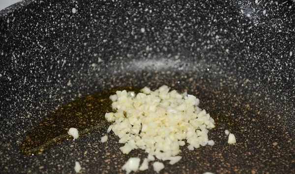 5、鍋裡再加一點油,然後將蒜蓉放入鍋中煸炒出香味。