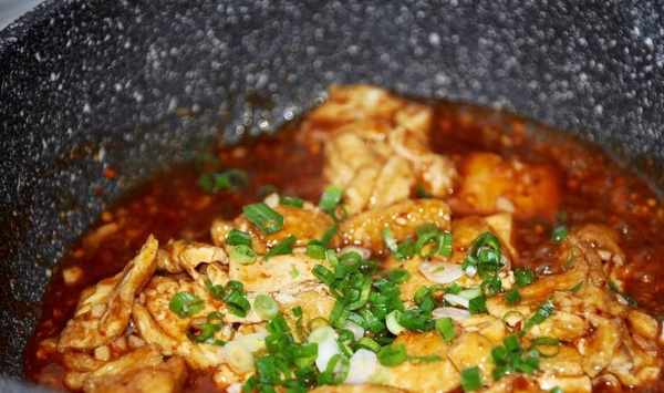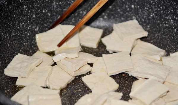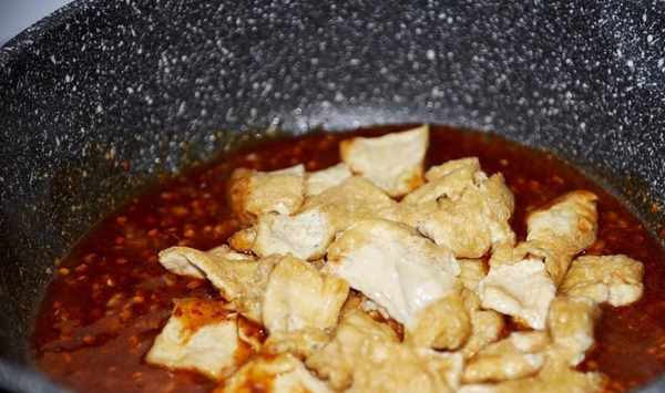 7、然後將剛才煎制好的包漿豆腐放入鍋中。