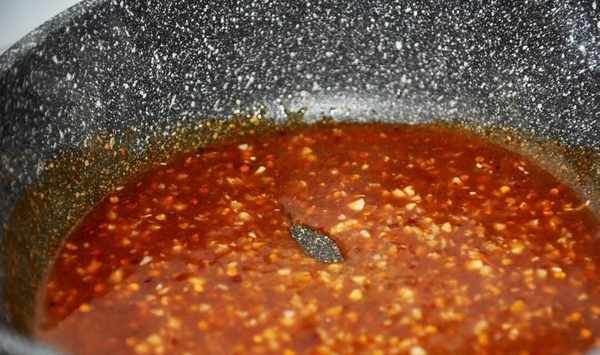 6、將剛才調好的醬汁倒入鍋中,一邊加熱一邊不停地攪拌,煮至醬汁粘稠。