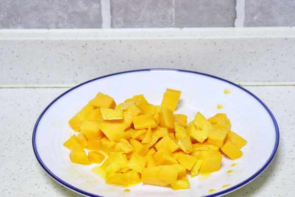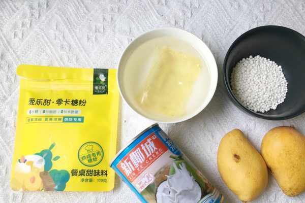 芒果2個、西米30克、椰奶200克、吉利丁片10克、糖20克;