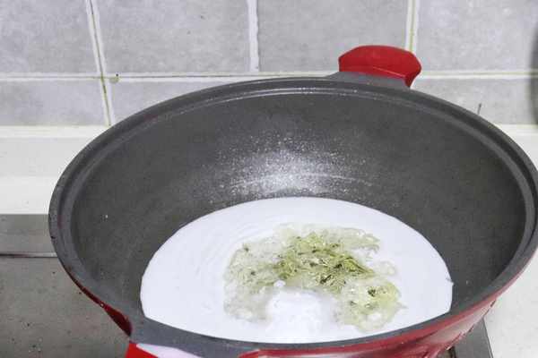5、再次起鍋,將椰奶、濾幹水分的吉利丁片、糖都放入鍋中,小火加熱至吉利丁片完全溶解即可熄火,再倒入西米,攪拌均勻;