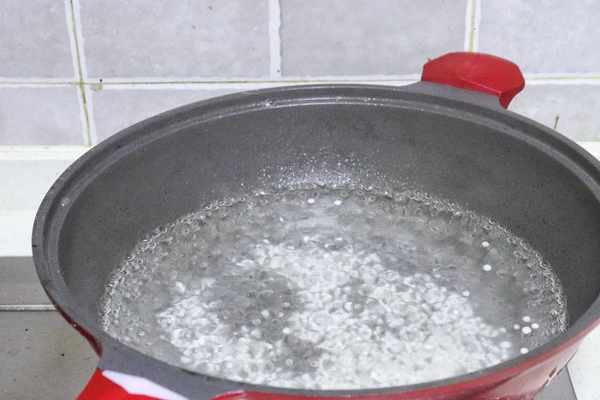 2、準備煮西米,鍋內倒入大量的清水,煮至沸騰冒泡時倒入西米,繼續中大火煮20分鐘左右,中途時不時攪拌防止粘鍋,直至西米隻能看見中間一點點小白點時熄火,蓋上鍋蓋燜15分鐘,直至西米完全透明;