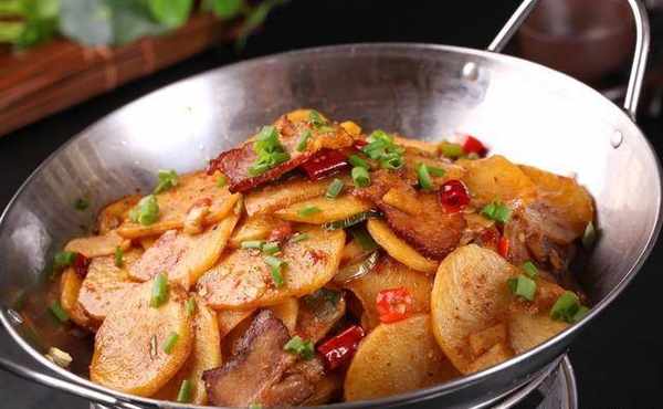 ①、讓豬肉洗凈切成薄片,土豆削皮洗凈切成薄片,幹辣椒洗凈切成小段,生薑洗凈切成薄片,蔥洗凈切成末備用。