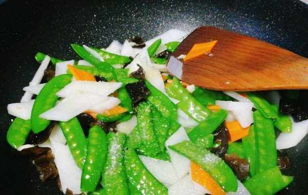 3、蒜瓣切末,起鍋燒油,翻入蒜末爆香,倒入荷蘭豆翻炒1分鐘,斷生後放入黑木耳、山藥片、胡蘿卜片,繼續翻炒1分鐘,加入適量食鹽、雞精、白糖調味,翻炒入味後即可出鍋。