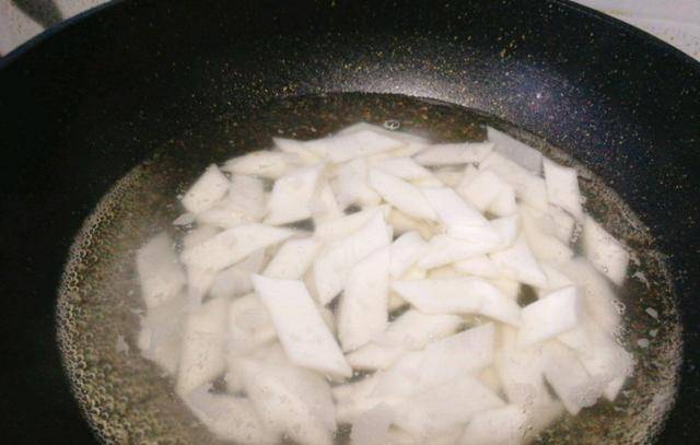 2、把筍外層的筍衣去掉,洗凈斜切成片,冷水下鍋煮開5分鐘(以去除筍內的大部分草酸),焯水撈出備用;