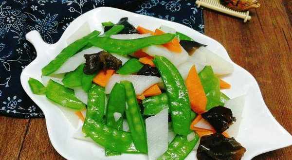 1、黑木耳提前泡發,撕成小朵;山藥去皮切片用清水浸泡,防止氧化發黑;胡蘿卜去皮洗凈後切片,荷蘭豆撕掉老筋,洗幹凈備用。