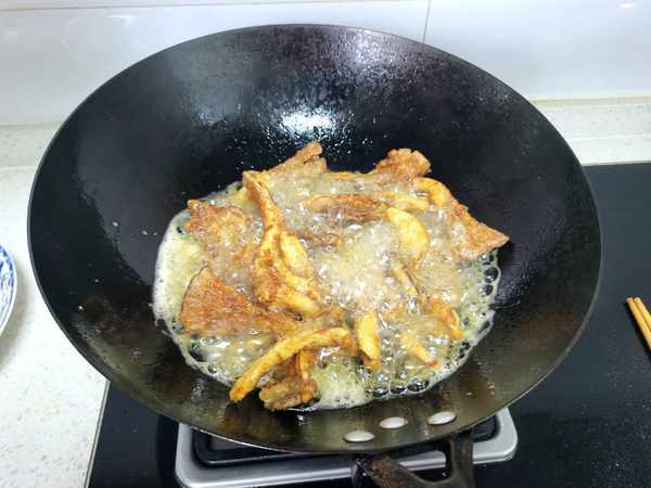 10、鍋裡熱油,一條一條放入蘑菇,用中小火慢炸,直到把蘑菇炸到酥脆就行。