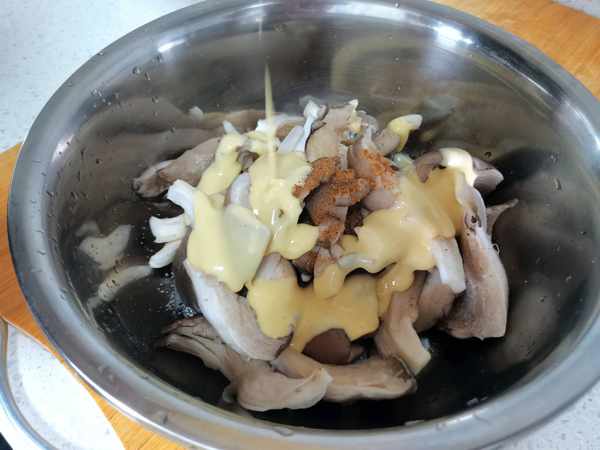 9、清洗幹凈的蘑菇,擠掉水分,撕成小片裝盆裡面,撒半勺鹽、半勺五香粉,攪拌均勻,再淋上用雞蛋和酥肉粉調制的酥皮糊糊。