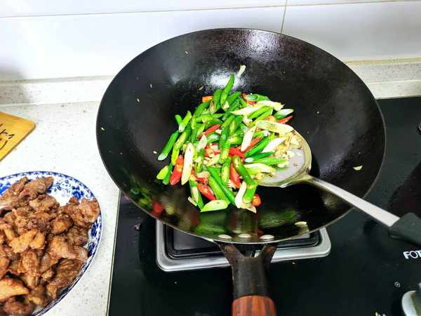 倒出鍋裡的油,鍋裡留少量油,撒一勺孜然粒,先炒出孜然的味道,再放蔥蒜、辣椒炒香。