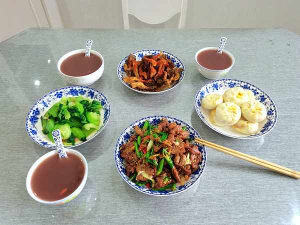 1、周末午餐:椒鹽牛肉片、幹炸蘑菇,八寶稀飯,南瓜包子,清炒油菜。