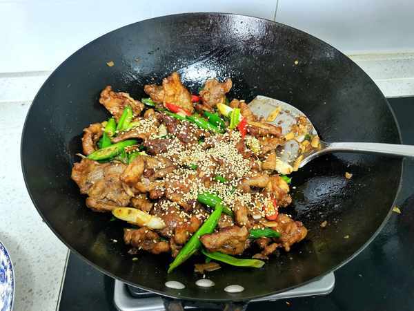 6、蔥蒜辣椒炒香後放入牛肉片,翻炒一分鐘左右,撒一勺雞精、一丁點鹽、兩勺孜然粉、一把白芝麻,翻炒均勻出鍋。