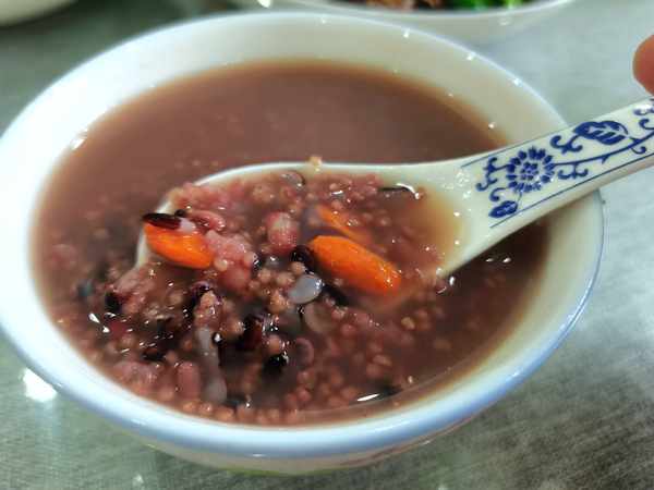 12、八寶稀飯裡面有黑米、小米、糯米、紅豆、枸杞,吃著有淡淡的清甜香味。