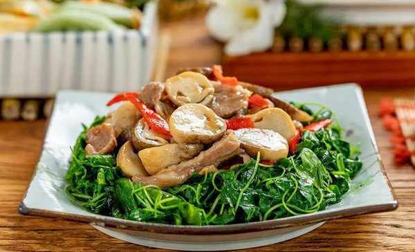 5、再熱鍋冷油,倒入草頭、淋入1大勺米酒熗鍋,1小勺鹽、1小勺糖調味,大火翻炒幾下,微軟出鍋,鋪上草菇、梅花肉食用