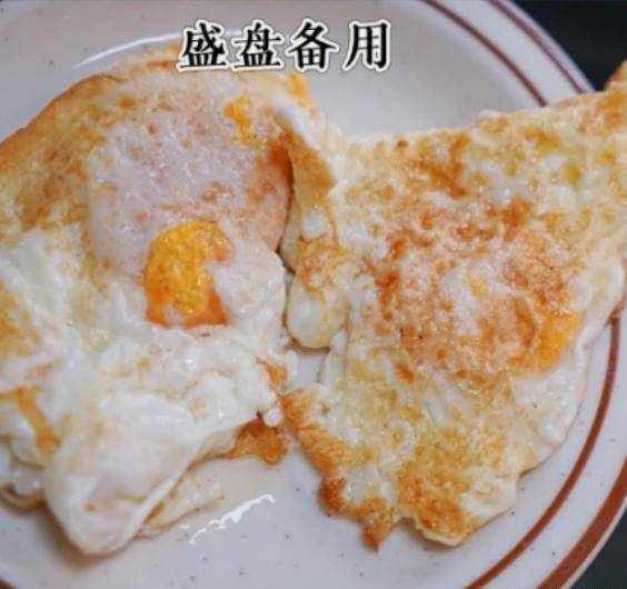 第三步:鍋中多放一些食用油,鍋底加上少許食鹽,兩枚雞蛋打在鍋中,中火煎至兩面定型,裝盤備用。