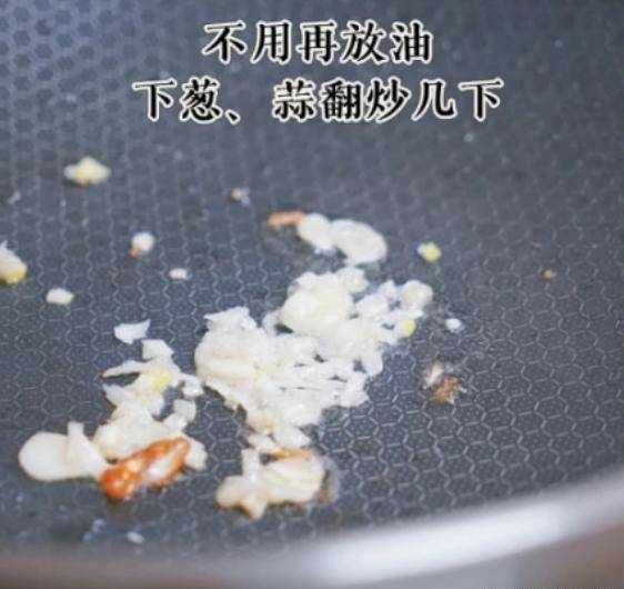 第四步:鍋中留少許油,加上一些蔥段和蒜末,讓香味激發出來,倒入韭菜炒至斷生。