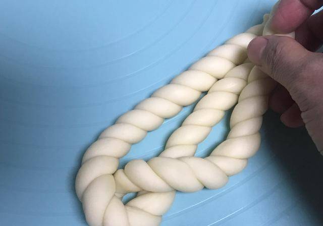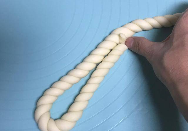 6、將醒發好的面團,先取兩根分別將其搓成細長條面條,且分別將其兩端朝相反方向扭搓,再將這兩根兩端粘在一起,如圖所示。