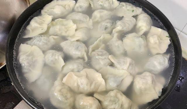 4、鍋中提前放入少許食鹽把水燒開,然後下入包好的餃子,水開後加入少許涼水,重復此動作,待第三次水開沸騰後,餃子就可以打撈出來瞭,咬上一口鮮嫩多汁,大人小孩都愛吃。