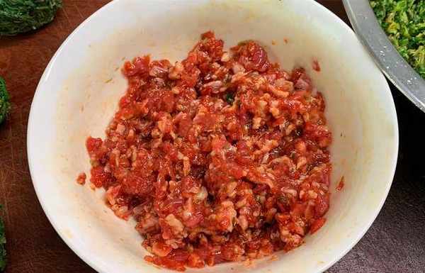 2、準備好的五花肉切成肉塊並剁成肉餡(不想麻煩的朋友也可以使用絞肉機),肉餡剁好後放入盆中,加入適量的生抽、鹽、蠔油、味精、再來少量的老抽和食用油,充分攪拌均勻醃制一會。