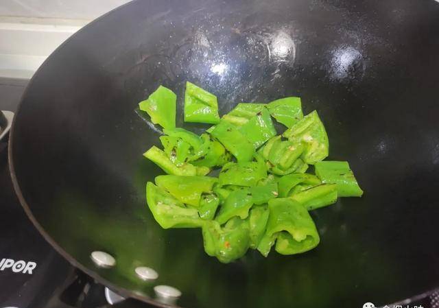 青椒先放在鍋裡面幹煸出虎皮狀,在煮的過程中會更加入味,炒這一道菜的話要多翻動,要不然很容易將它煮焦。