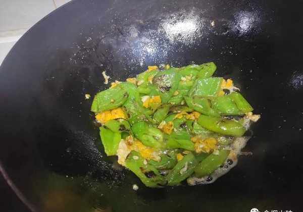 3.青椒炒成虎皮的狀態之後,我們把它盛出之後放到一旁。然後鍋裡面再倒入倒油,之後把雞蛋液放入油鍋中,小火煎成塊。雞蛋煎熟後,直接將青椒放入裡面,青椒下鍋後用鏟子快速翻炒,炒均勻;