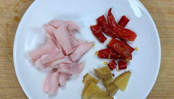 2、買兩塊錢的五花肉,用冷水把它表面的灰塵沖洗幹凈,再把它切成薄片,最後改刀切成小塊。幹辣椒也沖洗表面的灰塵後掰成小段(適量放),生薑切片後也切成小塊,把配菜裝盤備用即可。