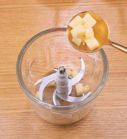 1.攪拌機中放入削皮切塊的蘋果,倒入牛奶,將兩者攪打均勻,碗中倒入蘋果泥、酵母粉和輔食油。