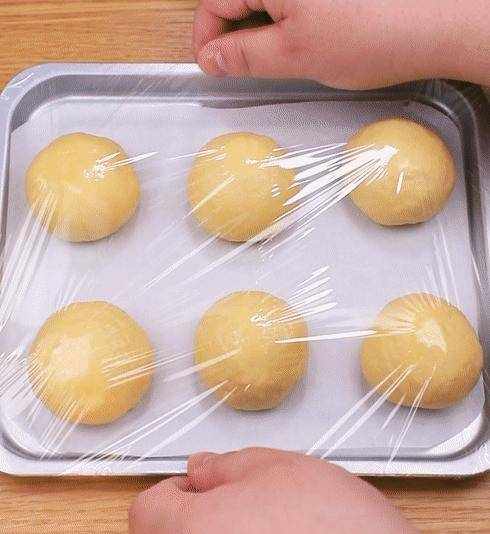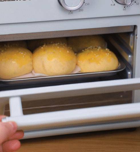 4.蓋上保鮮膜二次發酵至1.5倍大,發酵好的小餐包刷上蛋液,撒上些許白芝麻,放入大宇空氣炸烤箱。