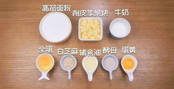 準備食材:蘋果塊60克,牛奶40克,輔食油15克,酵母3克,全蛋1個,蛋黃1個,高筋面粉200克,白芝麻適量