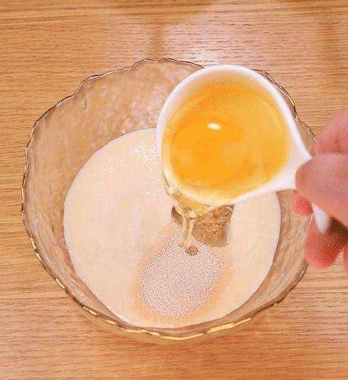 2.打入一個雞蛋,攪拌均勻後篩入高筋面粉,用刮刀翻拌至無幹粉狀抱團,蓋上保鮮膜,發酵至兩倍大。