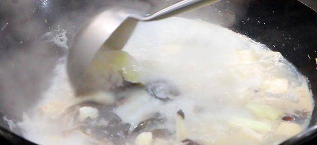 3.等湯汁燉至乳白色時開始調味,加入雞粉,白糖,食鹽,胡椒粉各適量,一分鐘後即可關火起鍋,再把魚頭豆腐湯倒入盆中,放少許香菜,淋入少許芝麻油,美味即成。