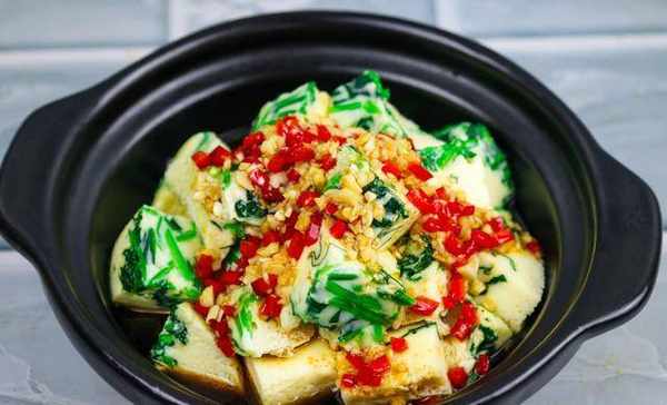 6.時間到瞭,取出菠菜雞蛋羹,用刀尖在小盆的邊上劃上一圈,再倒扣在幹凈的菜板上,用刀切成小塊,放入瓦煲裡面,美味即成。