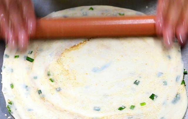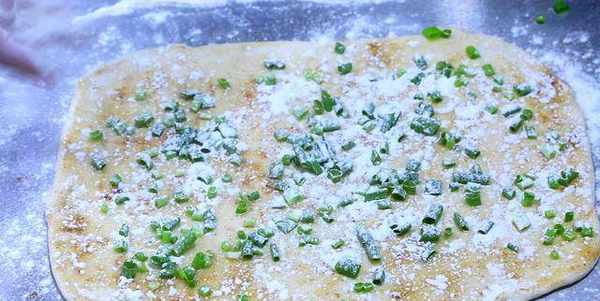 用搟面杖搟成長方形的面皮,撒上少許食鹽,淋上少許食用油,撒上少許十三香和小蔥花,再撒上少許面粉,這樣可以避免蔥花漏出。
