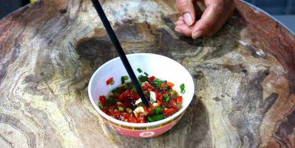 4.幾粒蒜子拍扁,切成蒜末,半個紅椒切成紅椒粒一起放入小盆中,加入生抽、香油適量,攪拌均勻備用。