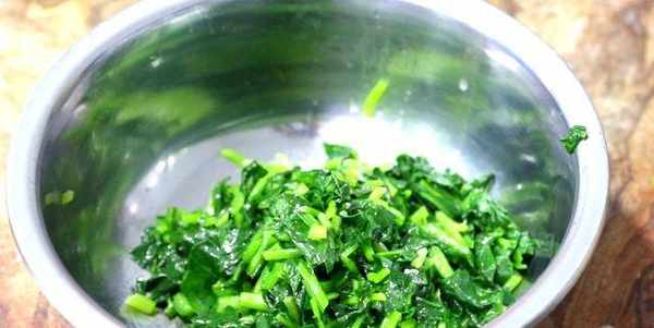 3.起鍋燒水,加入少許植物油,水開後下入菠菜,焯水一分鐘,撈出控水,再過涼水,放菜板上,切成小段,放入小盆中。