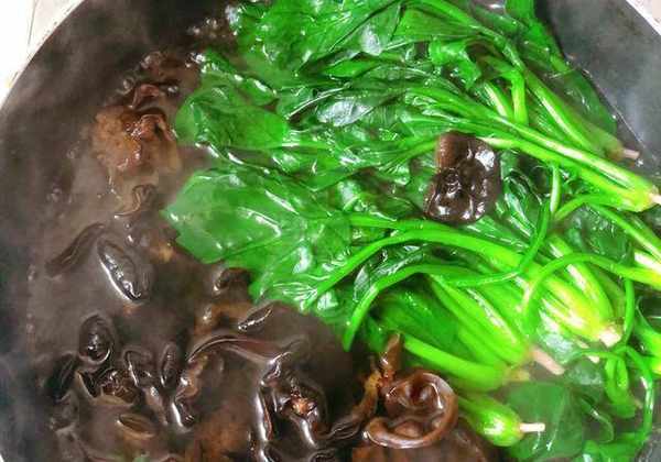 1、準備一把新鮮的菠菜,把菠菜摘洗幹凈,另外準備一把黑木耳,提前用清水泡軟泡脹,起鍋燒水,水開放入菠菜,焯燙一分鐘,再放入木耳,焯燙4-5分鐘,煮熟後撈出,過一遍涼水,控幹水分。