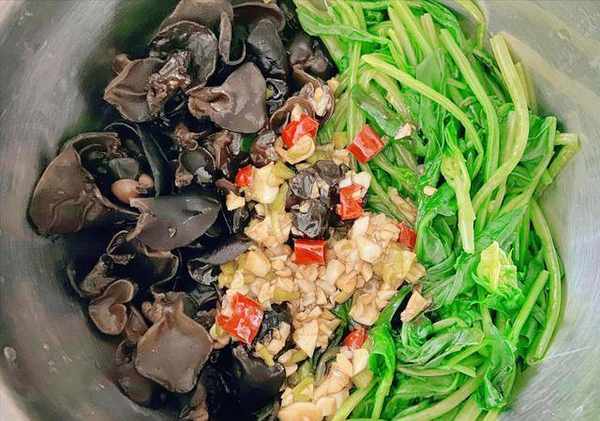 2、把木耳和菠菜控幹水分,裝入盆中,碗中加入蒜末、小米椒淋入熱油,激發出香味,調味加生抽、陳醋、香油、雞精,倒入菠菜中,翻拌均勻,就可以上桌瞭。