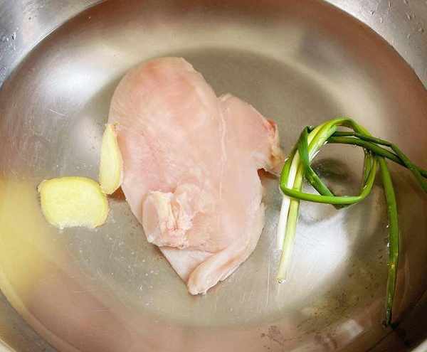1、雞胸肉雖然也是肉,但它的熱量很低,可以滿足口感,又不會堆積脂肪,準備兩塊新鮮的雞胸肉,放入水中,加入蔥薑、料酒,煮十分鐘左右,撈出撕成細絲。