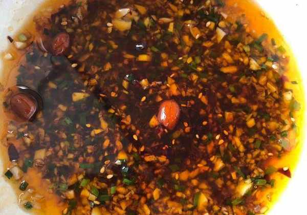 2、簡單搭配一個料汁,完全可以按照個人的口味,碗中加入蒜末、小米椒、辣椒,淋入熱油,激發出香味,調味放白糖、食鹽、生抽、蠔油和香醋,攪拌均勻,不喜歡吃辣的可以不放,再準備點黃瓜絲。