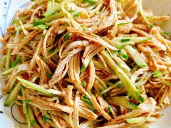 3、把調好的料汁,直接倒入在雞絲上面,顛盆翻拌均勻,一道美味可口的涼拌雞絲就制作完成瞭,雞胸肉肉質細嫩,滋味鮮美,營養豐富,涼拌一下更好吃。