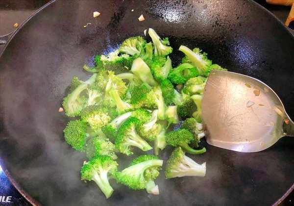2、起鍋燒油,油熱放入蒜末爆香,接著倒入西蘭花,大火翻炒一會兒,炒至斷生,調味放少許的食鹽、生抽和雞精,炒勻出鍋。
