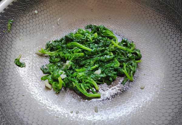 鍋裡加一塊豬油,倒入蒜蓉爆香,再放入茼蒿炒至變軟,加點鹽調味就可以瞭。