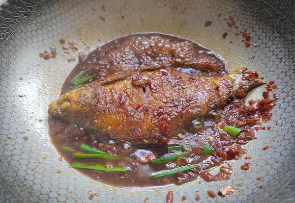 鯿魚讓賣魚的阿姨幫忙處理幹凈瞭,拿回來沖洗一下,兩面裹上玉米淀粉,這樣煎的時候不粘鍋不破皮。碗裡加點鹽、白糖、生抽、蠔油、料酒、紅燒醬油,再倒入半碗清水拌勻,調成料汁。鍋裡倒油,撒點鹽,再放入鯿魚,煎至兩面金黃,加一些薑片和幹辣椒面煸香,倒入料汁燒至入味,最後加點蒜苗增加香味,就可以出鍋瞭!