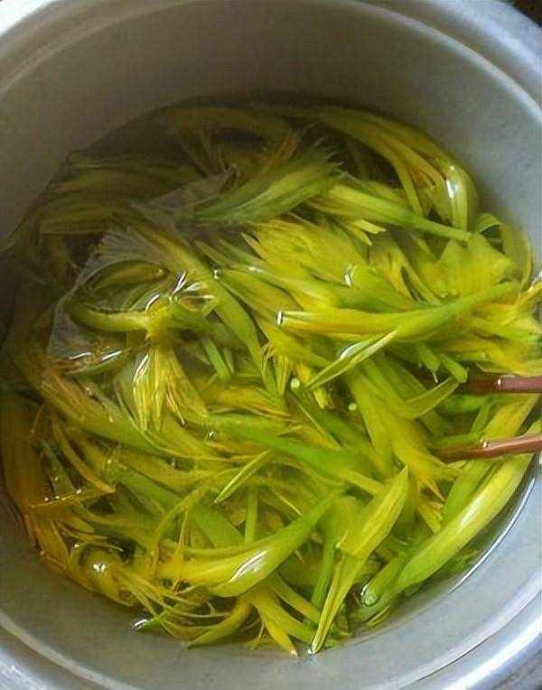 第二:起鍋煮一些清水,煮沸後加上一小勺食鹽,倒入洗凈的黃花菜,焯水2分鐘左右,撈出浸泡在冷水裡,最後控幹掉水分。