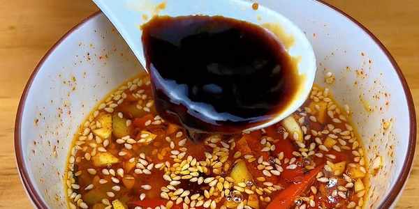 8.再把炸花生米的油淋入調料碗中激發一下香氣。