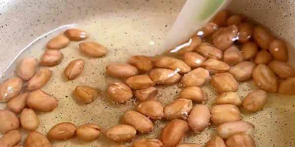 7.起鍋燒水,油熱下入一把花生把它炸香。