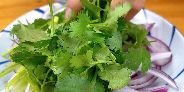 5.準備一些配菜,自己喜歡吃的就可以。半個洋蔥切絲,香菜切段。