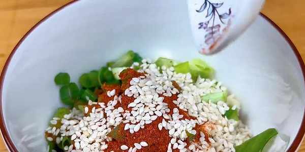 6.小米辣切圈、大蒜切末、香蔥切蔥花放入碗中,調入一勺辣椒面跟白芝麻。