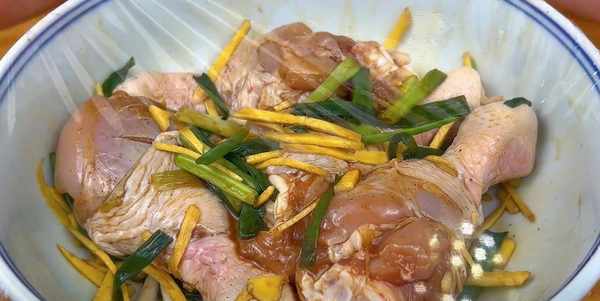 3.雞腿放入盆中,調入生薑絲跟一把蔥段,加入鹽、胡椒粉,少許生抽,抓拌均勻醃制入味。最好把蔥薑汁水抓出來,增香又去腥。
