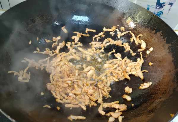 6、炒鍋裡加油,油溫四成熱左右下入醃制好的肉絲,把肉絲炒散、炒至變色後加入蔥花炒出香味。