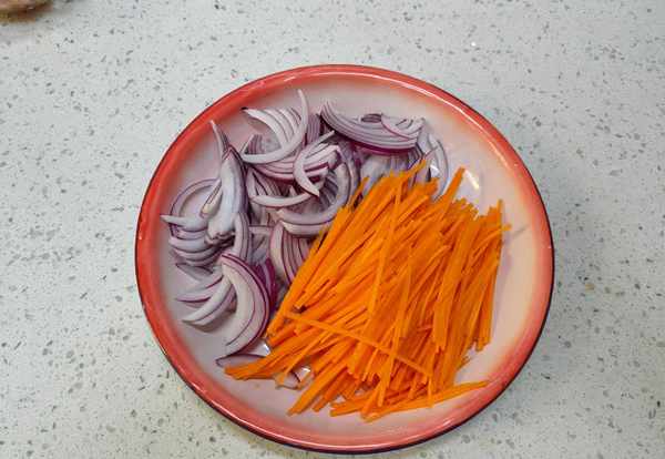 2、炒面的配菜可以根據自己的喜好來搭配,我這裡用到的是洋蔥絲、胡蘿卜絲,當然大傢還可以搭配蒜薹、尖椒絲等等。
